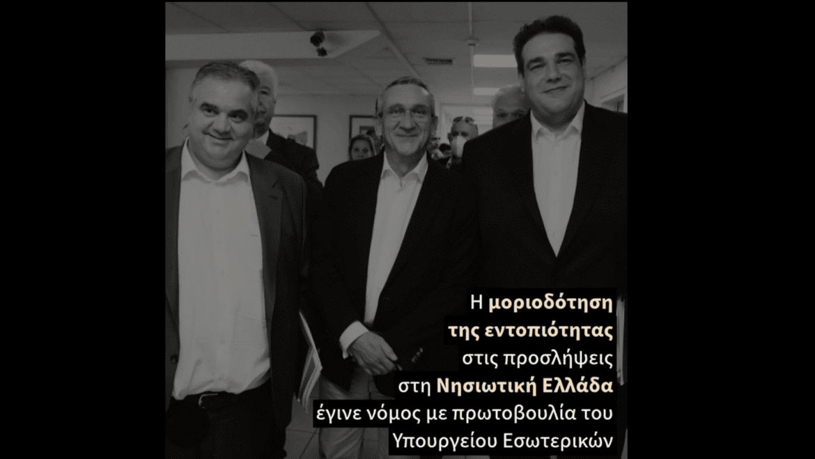 Πριμοδότηση στην εντοπιότητα ζητούσαμε πολλά χρόνια και επιτέλους αυτό θεσμοθετήθηκε. Η σημερινή πολιτική ηγεσία του Υπουργείου Εσωτερικών μας κατάλαβε και τους ευχαριστούμε. Η καθοριστική μοριοδότηση της εντοπιότητας για τη Νησιωτική Ελλάδα είναι πλέον νόμος του Κράτους.