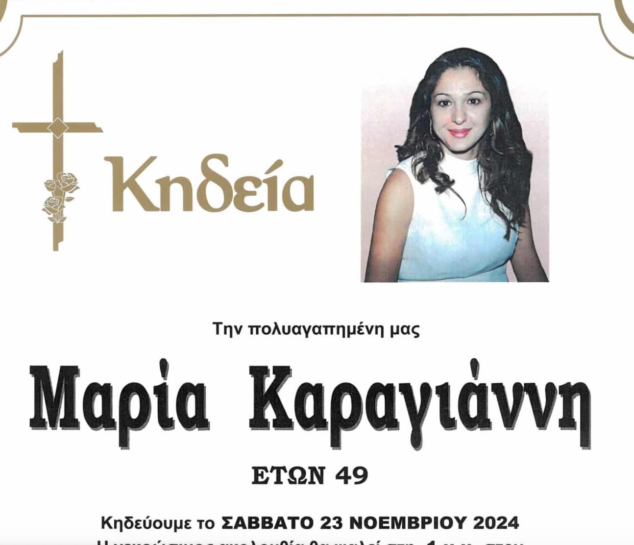 Στο πένθος βύθισε την οικογένεια, τους φίλους και όλους όσοι της γνώρισαν και την αγάπησαν, η είδηση του θανάτου της Μαρίας Καραγιάννη, συζύγου του Δημήτρη Ξηρουχάκη.