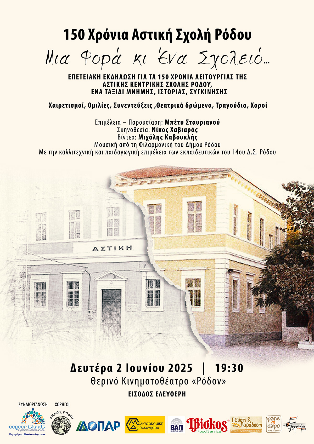 Το 14ο Δημοτικό Σχολείο Ρόδου τιμά την ιστορική διαδρομή του και διοργανώνει επετειακή εκδήλωση με αφορμή τη συμπλήρωση 150 χρόνων λειτουργίας της Αστικής Κεντρικής Σχολής Ρόδου.