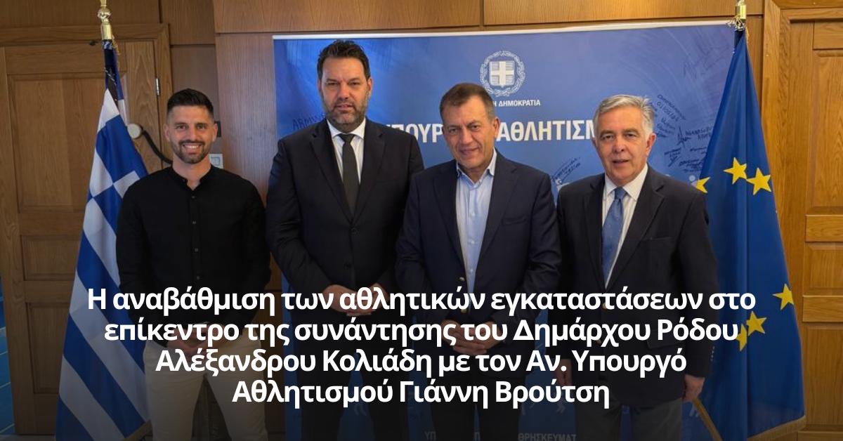 Με στόχο την ενίσχυση του αθλητισμού και την αναβάθμιση των υποδομών της Ρόδου, ο Δήμαρχος Ρόδου, Αλέξανδρος Κολιάδης, είχε εποικοδομητική συνάντηση στην Αθήνα με τον Αναπληρωτή Υπουργό Αθλητισμού, Γιάννη Βρούτση, παρουσία του εντεταλμένου συμβούλου Αθλητισμού του Δήμου Ρόδου, Μιχάλη Πλύγκου, και του Βουλευτή Δωδεκανήσου της Νέας Δημοκρατίας, Βασίλη Υψηλάντη.