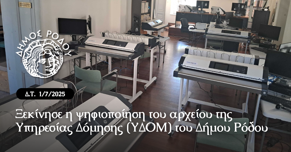 Σε εξέλιξη βρίσκεται η διαδικασία ψηφιοποίησης του αρχείου της Υπηρεσίας Δόμησης (ΥΔΟΜ) Ρόδου, στο πλαίσιο του έργου «Ψηφιοποίηση Αρχείων Πολεοδομικής Πληροφορίας», το οποίο υλοποιείται από το Τεχνικό Επιμελητήριο Ελλάδας (ΤΕΕ).