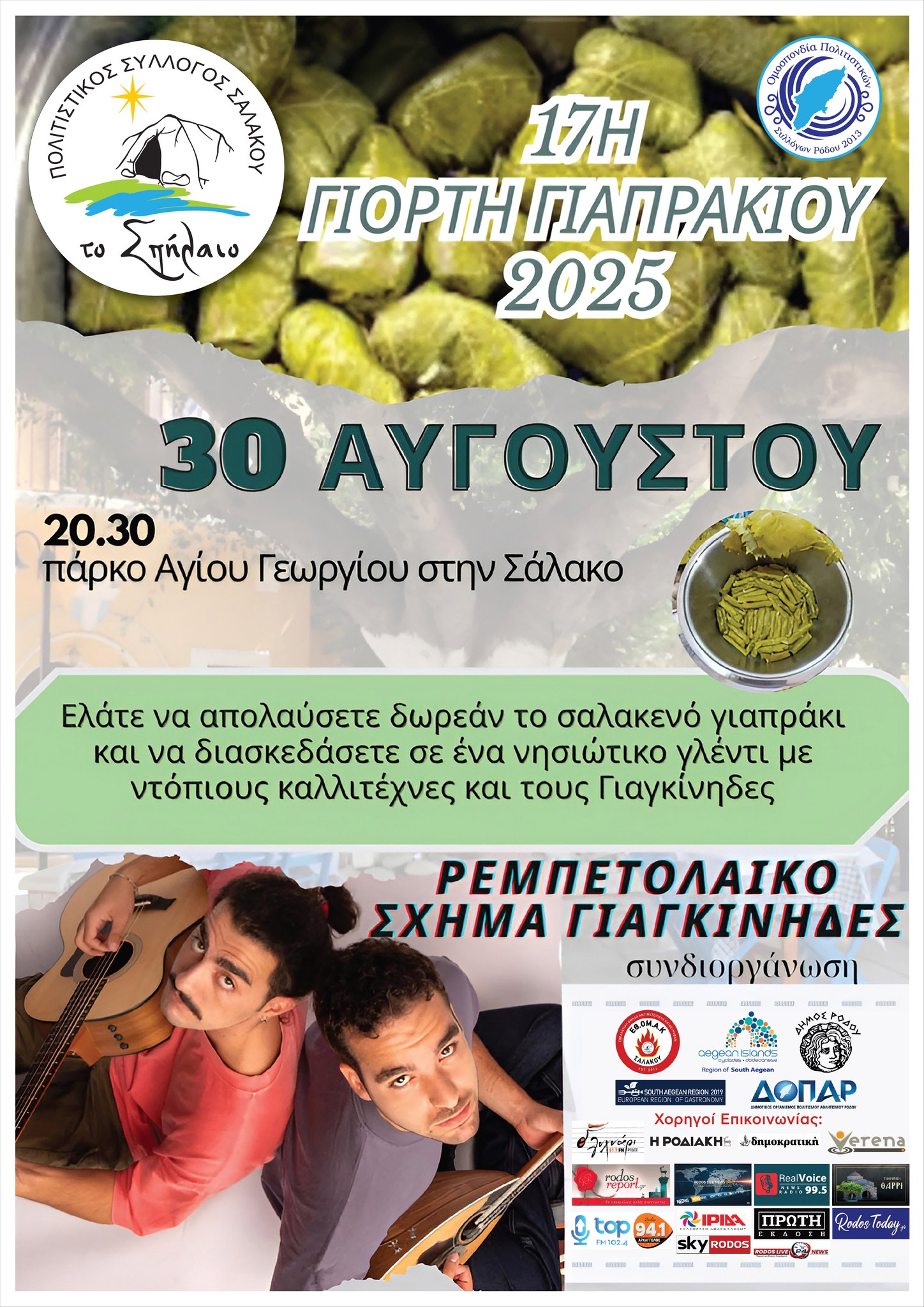 Το Σάββατο, 30 Αυγούστου 2025, στις 20:30, το Πάρκο Αγίου Γεωργίου στη Σάλακο θα γεμίσει αρώματα, γεύσεις και μουσικές, καθώς ο Πολιτιστικός Σύλλογος Σαλάκου «Το Σπήλαιο», σε συνεργασία με την Ομοσπονδία Πολιτιστικών Συλλόγων Ρόδου, την περιφέρεια Νοτίου Αιγαίου, τον δήμο Ρόδου, τον ΔΟΠΑΡ και την ΕΘ.ΟΜ.Α.Κ. Σαλάκου, διοργανώνει για 17η συνεχή χρονιά τη μεγάλη Γιορτή Γιαπρακιού.