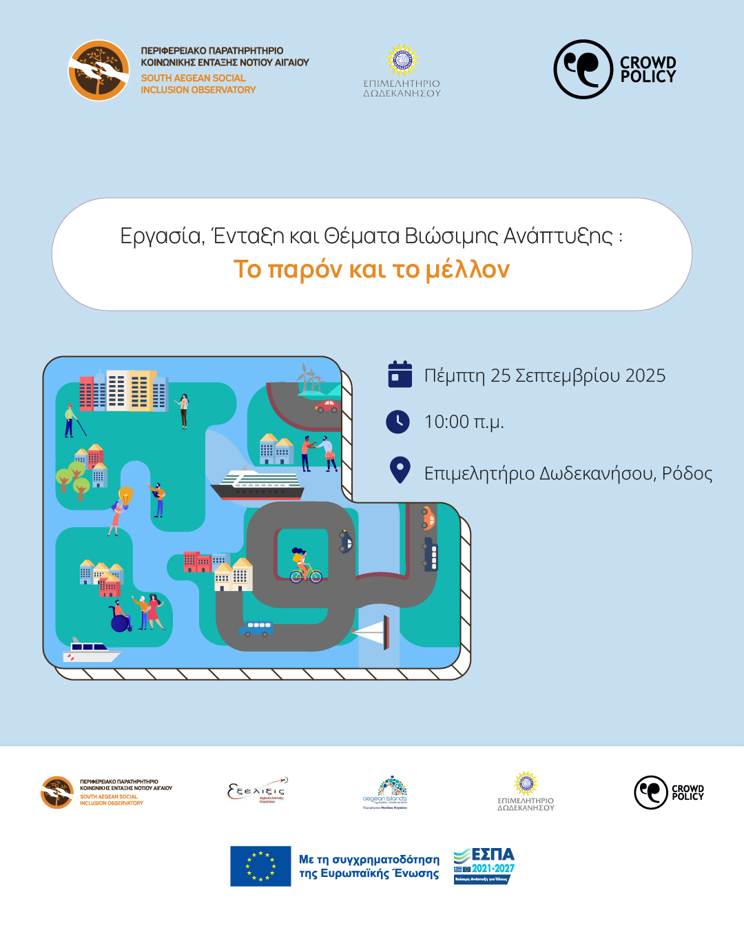 Η Ημερίδα εντάσσεται στις δράσεις επικοινωνίας και δημοσιότητας του Περιφερειακού Παρατηρητηρίου Κοινωνικής Ένταξης Νοτίου Αιγαίου και υλοποιείται με την υποστήριξη της εταιρείας τεχνολογίας και καινοτομίας Crowdpolicy.