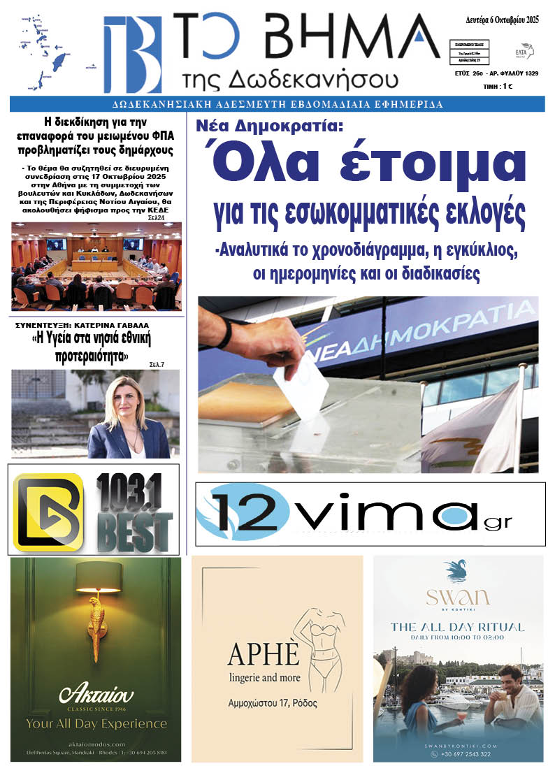 ΕΦΗΜΕΡΙΔΑ ΕΝΤΥΠΗ ΕΚΔΟΣΗ 10 Οκτωβρίου, 2025 Κοινοποίηση FacebookTwitterPinterestWhatsApp Περισσότερα άρθρα ΕΝΤΥΠΗ ΕΚΔΟΣΗ 23 Σεπτεμβρίου, 2025 ΕΝΤΥΠΗ ΕΚΔΟΣΗ 15 Σεπτεμβρίου, 2025 ΕΝΤΥΠΗ ΕΚΔΟΣΗ 8 Σεπτεμβρίου, 2025 ENTYΠΗ ΕΚΔΟΣΗ 14 Αυγούστου, 2025 ΕΝΤΥΠΗ ΕΚΔΟΣΗ 27 Ιουλίου, 2025 ΕΝΤΥΠΗ ΕΚΔΟΣΗ 15 Ιουλίου, 2025 Κοινοποίηση FacebookTwitterPinterestWhatsApp Προηγούμενο άρθροΗ Κάλυμνος “χορεύει με τον κόσμο” – Η Πολωνική Τηλεόραση προβάλλει το νησί σε ολόκληρη την Ανατολική ΕυρώπηΕπόμενο άρθροΣυνάντηση εργασίας στη Δημοτική Ενότητα Πεταλούδων ΡΟΗ ΕΙΔΗΣΕΩΝ Νέο «δώρο» στους συνταξιούχους: 2.000 ευρώ τον μήνα μαζί με τη σύνταξη 17 Οκτωβρίου, 2025 Μαθεύτηκε η τραγική αλήθεια για τον 44χρονο που έκανε βουτιά θανάτου σήμερα από τον Πύργο Απόλλων 17 Οκτωβρίου, 2025 Από καφέ στον 24ο όροφο του πύργου «Απόλλων» έπεσε ο 44χρονος – Κι άλλη αuτοκτονiα πριν έξι μήνες 17 Οκτωβρίου, 2025 Σοκ στο κέντρο της Αθήνας: Άνδρας έπεσε από τον Πύργο «Απόλλων» στους Αμπελόκηπους και σκοτώθηκε 17 Οκτωβρίου, 2025 Πέθανε θρυλικός κιθαρίστας και ιδρυτικό μέλος ιστορικού συγκροτήματος 17 Οκτωβρίου, 2025 Τροχαίο-σοκ στην χώρα μας με 2 νεκρούς και 4 τραυματίες – «Το ένα αυτοκίνητο ήταν μέσα στο άλλο» 17 Οκτωβρίου, 2025 ΕΚΤΑΚΤΟ ΣΟΚ ΤΩΡΑ : ΝΕΚΡΟΣ ΠΑΣΙΓΝΩΣΤΟΣ ΠΡΟΕΔΡΟΣ ΠΟΔΟΣΦΑΙΡΙΚΗΣ ΟΜΑΔΑΣ – ΤΟΝ ΔΟΛΟΦΟΝΗΣΑΝ ΣΤΗ ΜΕΣΗ ΤΟΥ ΔΡΟΜΟΥ 17 Οκτωβρίου, 2025 ΔΕΥΑΡ: Προσωρινή διακοπή υδροδότησης στην Τ.Κ. Μαριτσών 17 Οκτωβρίου, 2025
