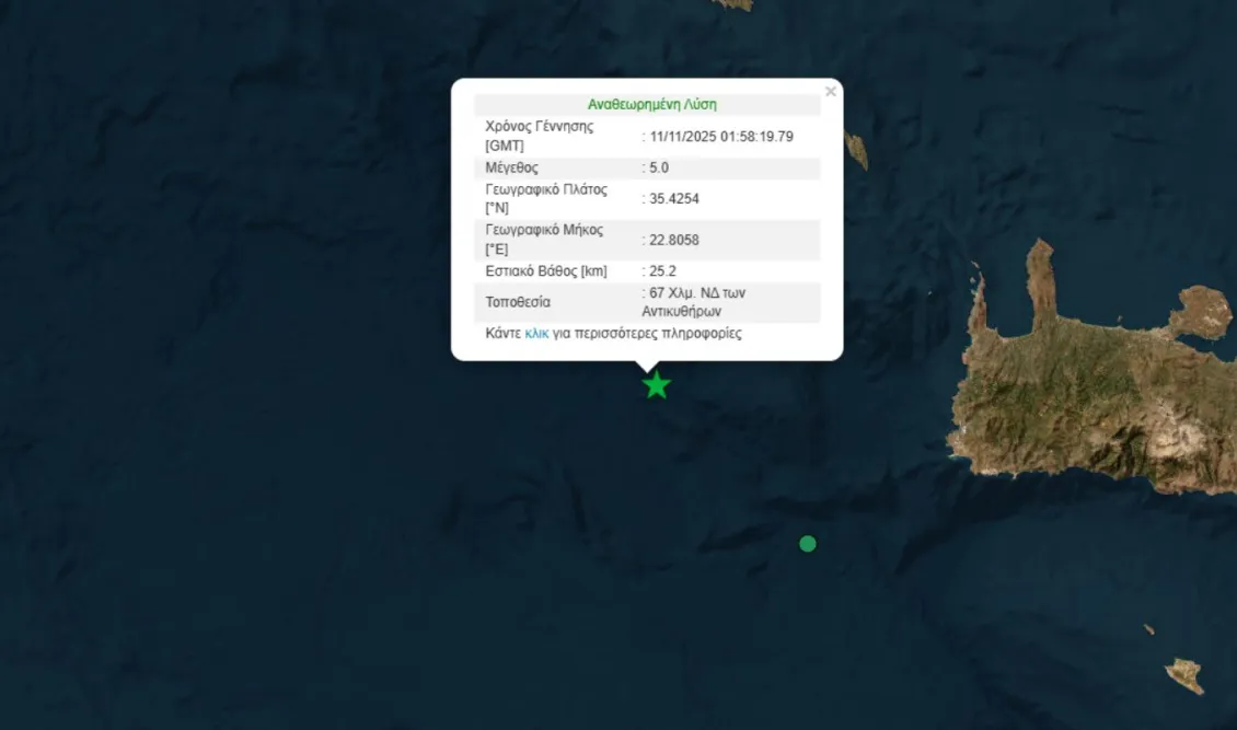 Σεισμός μεγέθους 5 βαθμών της κλίμακας Ρίχτερ καταγράφηκε λίγο πριν από τις 4 τα ξημερώματα της Τρίτης στην θαλάσσια περιοχή ανοιχτά των Αντικυθήρων.