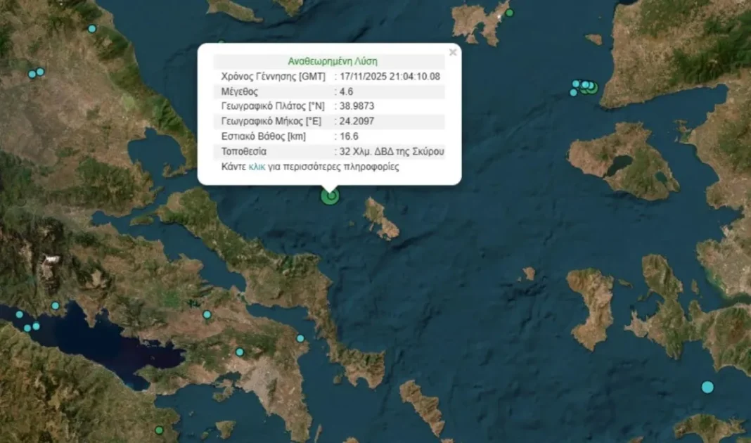 Σεισμός μεγέθους 4,6 Ρίχτερ σημειώθηκε το βράδυ της Δευτέρας 17/11 στην Σκύρο σύμφωνα με το Γεωδυναμικό Ινστιτούτο, ενώ έγινε αισθητός και σε αρκετές περιοχές της Αττικής. Συγκεκριμένα, σύμφωνα με την αυτόματη λύση του Γεωδυναμικού Ινστιτούτου το επίκεντρο της δόνησης ήταν στα 32 χιλιόμετρα ΔΒΔ της Σκύρου. Παράλληλα, το εστιακό βάθος ήταν στα 16,6 χιλιόμετρα.