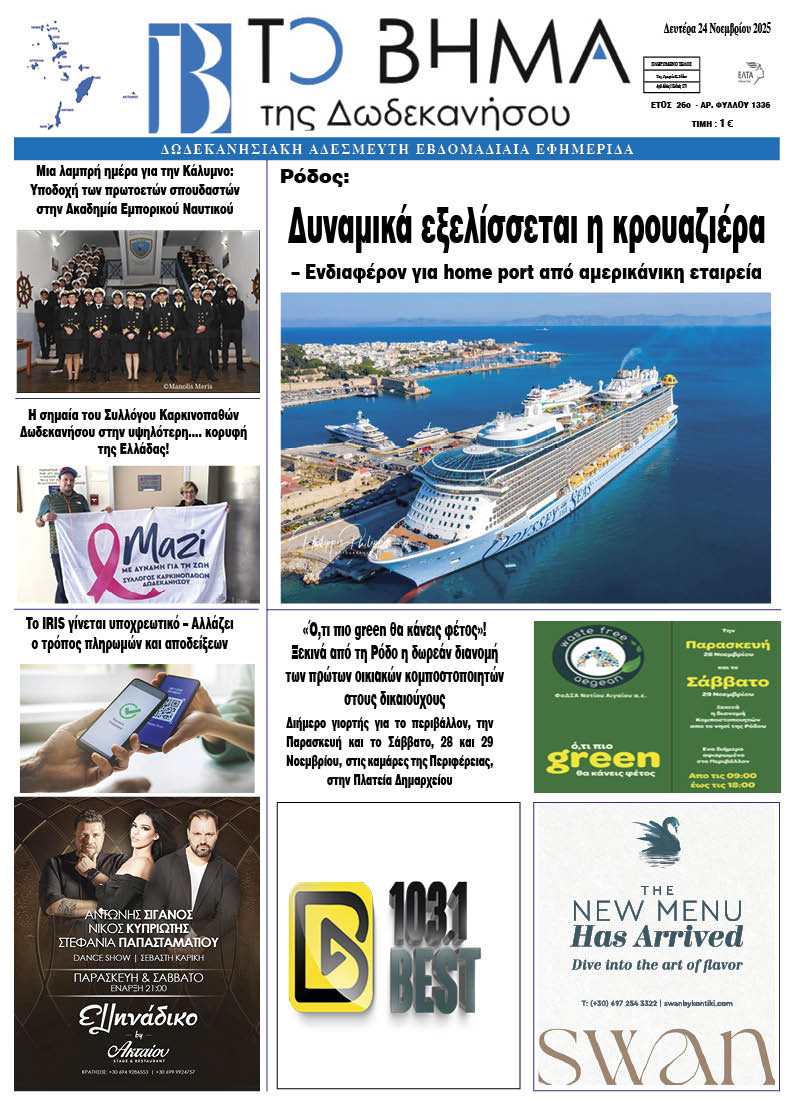 ΕΦΗΜΕΡΙΔΑ ΕΝΤΥΠΗ ΕΚΔΟΣΗ 24 Νοεμβρίου, 2025 Κοινοποίηση FacebookTwitterPinterestWhatsApp Περισσότερα άρθρα ΕΝΤΥΠΗ ΕΚΔΟΣΗ 24 Νοεμβρίου, 2025 ΕΝΤΥΠΗ ΕΚΔΟΣΗ 8 Νοεμβρίου, 2025 ΕΝΤΥΠΗ ΕΚΔΟΣΗ 8 Νοεμβρίου, 2025 ENTYΠΗ ΕΚΔΟΣΗ 18 Οκτωβρίου, 2025 ΕΝΤΥΠΗ ΕΚΔΟΣΗ 10 Οκτωβρίου, 2025 ΕΝΤΥΠΗ ΕΚΔΟΣΗ 23 Σεπτεμβρίου, 2025 Κοινοποίηση FacebookTwitterPinterestWhatsApp Προηγούμενο άρθροΕΝΤΥΠΗ ΕΚΔΟΣΗΕπόμενο άρθροΡόδος: Δυναμικά εξελίσσεται η κρουαζιέρα – Ενδιαφέρον για home port από αμερικάνικη εταιρεία ΡΟΗ ΕΙΔΗΣΕΩΝ Ρόδος: Δυναμικά εξελίσσεται η κρουαζιέρα – Ενδιαφέρον για home port από αμερικάνικη εταιρεία 24 Νοεμβρίου, 2025 ΕΝΤΥΠΗ ΕΚΔΟΣΗ 24 Νοεμβρίου, 2025 Πρόοδος στις συνομιλίες ΗΠΑ – Ουκρανίας για τον τερματισμό του πολέμου: “Ουσιαστικό βήμα μπροστά” – Η κοινή δήλωση 24 Νοεμβρίου, 2025 Αγρότες προχωρούν σε κινητοποιήσεις: Κλείνουν Εθνική Οδό, λιμάνια και αεροδρόμια – “Λεφτά για τους αγρότες κι όχι για φρεγάτες” 24 Νοεμβρίου, 2025 Επίδομα 250 ευρώ: Από σήμερα Δευτέρα η μόνιμη οικονομική ενίσχυση στους συνταξιούχους – Ποιοι την δικαιούνται 24 Νοεμβρίου, 2025 Αυξήσεις μισθών και συντάξεων: Φοροελαφρύνσεις 1,76 δισ. ευρώ στον νέο Προϋπολογισμό – Αναλυτικά οι κυριότερες παρεµβάσεις 24 Νοεμβρίου, 2025 Έναρξη Κύριων Κυκλοφοριακών Ρυθμίσεων της Β’ Φάσης του έργου από την Κυριακή 23 Νοεμβρίου 2025 23 Νοεμβρίου, 2025 Εξιχνιάστηκε υπόθεση ληστείας στη Ρόδο 22 Νοεμβρίου, 2025