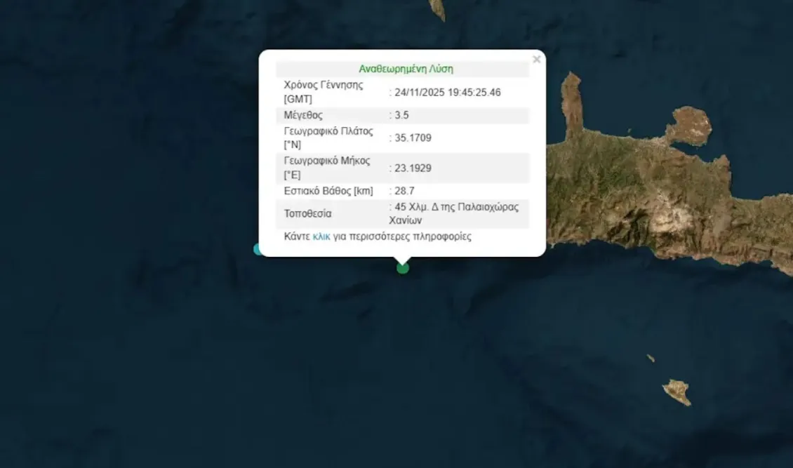 Σύμφωνα με το Γεωδυναμικό Ινστιτούτο του Εθνικού Αστεροσκοπείου Αθηνών, ο σεισμός των 3,5 Ρίχτερ στα Χανιά έχει επίκεντρο τη θαλάσσια περιοχή που απέχει 45 χιλιόμετρα δυτικά της Παλαιοχώρας