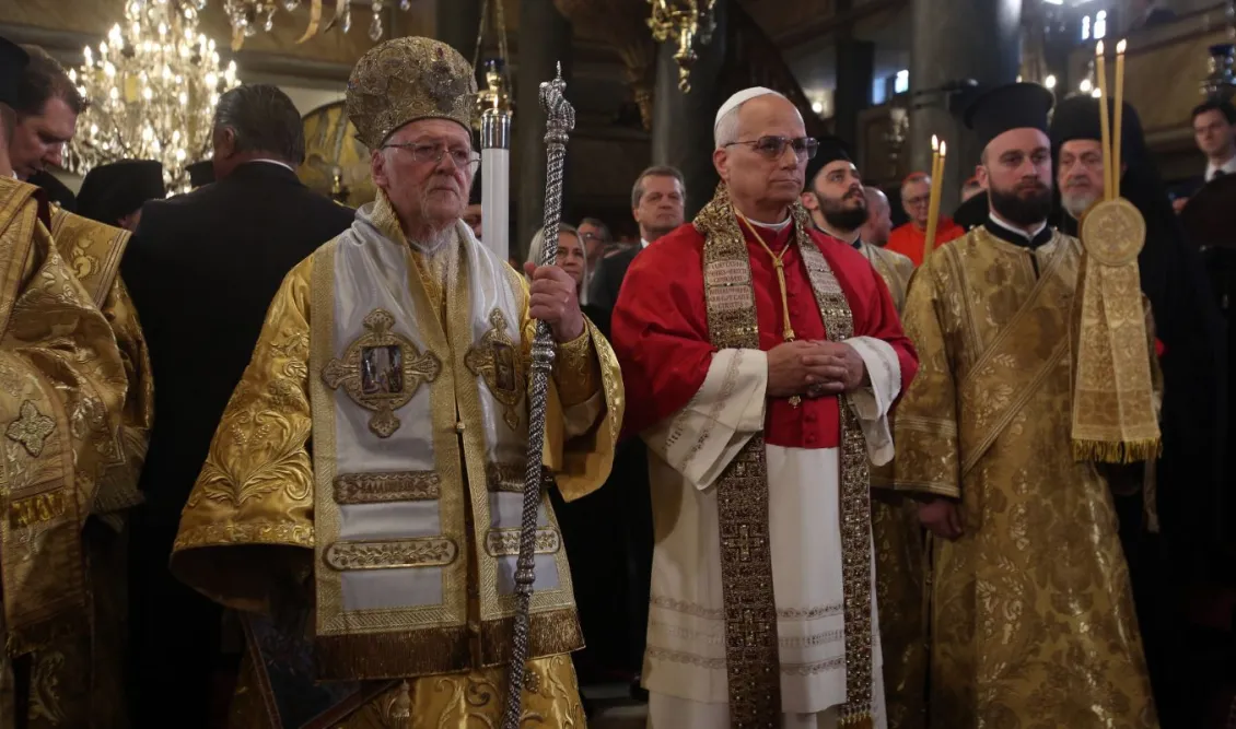 Οι τοποθετήσεις των δύο ιεραρχών έγιναν μετά τη Θεία Λειτουργία στον Πατριαρχικό Ναό του Αγίου Γεωργίου στην Κωνσταντινούπολη, όπου προεξήρχε ο Οικουμενικός Πατριάρχης Βαρθολομαίος και συλλειτούργησε ο Πατριάρχης Αλεξανδρείας Θεόδωρος, παρουσία του Πάπα. Ο Λέων ΙΔ΄ έφτασε στο Φανάρι λίγο μετά τις 10.30, όπου τον υποδέχθηκαν ο Αρχιεπίσκοπος Αμερικής Ελπιδοφόρος και ο Μητροπολίτης Γέρων Χαλκηδόνος Εμμανουήλ. Με τις καμπάνες να ηχούν πανηγυρικά, ο Ποντίφικας κατευθύνθηκε προς τον ναό, άναψε ένα κερί και μαζί με τον Πατριάρχη προσκύνησαν τα λείψανα των Αποστόλων Πέτρου και Ανδρέα, του οποίου η μνήμη τιμήθηκε χθες.