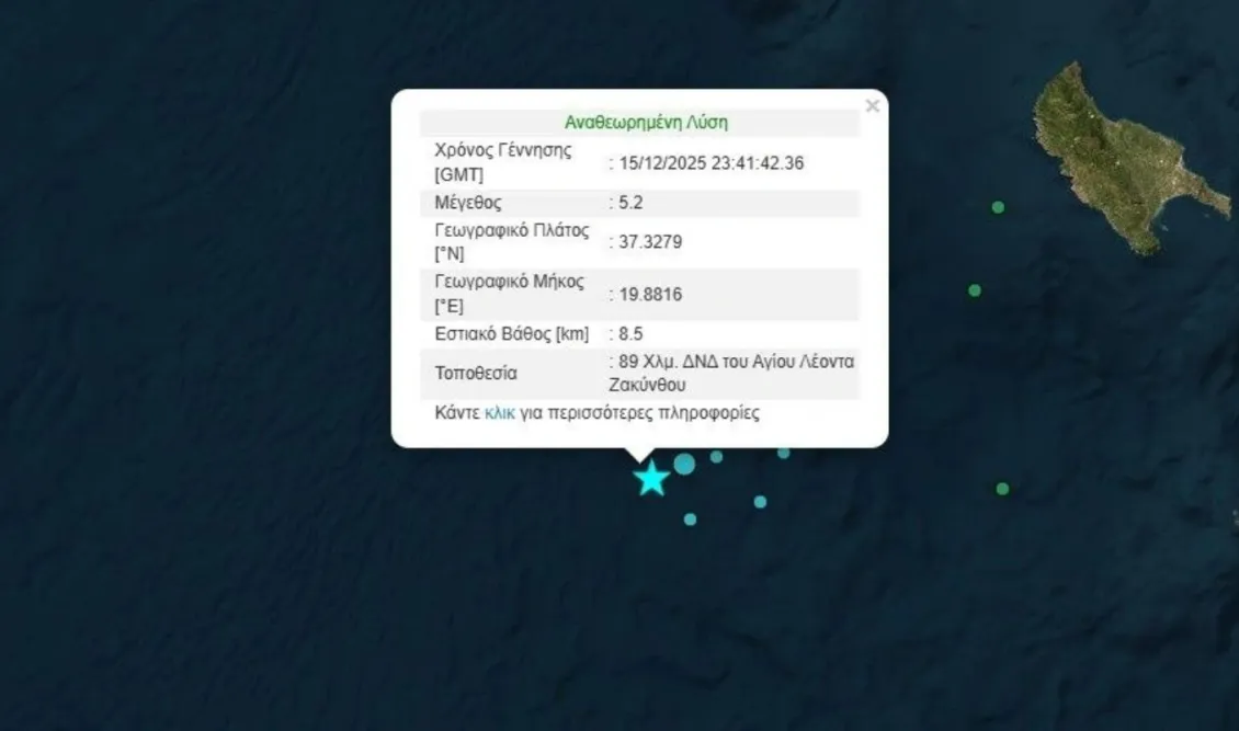 ΕΛΛΑΔΑ Σεισμός 5,2 Ρίχτερ ανοιχτά της Ζακύνθου 16 Δεκεμβρίου, 2025 Κοινοποίηση FacebookTwitterPinterestWhatsApp Περισσότερα άρθρα Ίμια, τριάντα χρόνια μετά: Η πολιτική διαχείριση μιας κρίσης που αναδιαμόρφωσε τις ισορροπίες στο Αιγαίο 30 Ιανουαρίου, 2026 Έρχεται νέο «Ανακαινίζω» από τον Μάιο: Ποια ακίνητα μπαίνουν, τι πληρώνεται και ποιες δεσμεύσεις αναλαμβάνουν οι ιδιοκτήτες 29 Ιανουαρίου, 2026 Πολύνεκρο τροχαίο στη Ρουμανία με οπαδούς του ΠΑΟΚ που ταξίδευαν στη Γαλλία – 7 νεκροί και 3 τραυματίες 27 Ιανουαρίου, 2026 Φωτιά στο εργοστάσιο της “Βιολάντα” στα Τρίκαλα: “Η μαμά είχε πάει στην δουλειά;” – Σοκάρει ο τρόπος που έμαθε την τραγωδία σύζυγος του θύματος 27 Ιανουαρίου, 2026 Έκρηξη στη βιομηχανία «Βιολάντα»: Βρέθηκε η σορός και της πέμπτης εργάτριας που σκοτώθηκε στο εργοστάσιο στα Τρίκαλα 26 Ιανουαρίου, 2026 Τραγωδία με 4 νεκρές στο εργοστάσιο «Βιολάντα»: Από τη χαρά στο πένθος – Θα ήταν 30 άτομα στη βάρδια αν δεν ήταν η κοπή... 26 Ιανουαρίου, 2026 Ισχυρή σεισμική δόνηση 5,2 Ρίχτερ σημειώθηκε το βράδυ της Τρίτης (16/12) στα ανοιχτά της Ζακύνθου. Το εστιακό βάθος του σεισμού είναι στα 8,5 χιλιόμετρα και το επίκεντρό του 89 χιλιόμετρα Δυτικά Νοτιοδυτικά του Αγίου Λέοντα Ζακύνθου Κοινοποίηση FacebookTwitterPinterestWhatsApp Προηγούμενο άρθρο123 γρ. κοκαΐνης έκρυβε στη βαλίτσα του 19χρονος Αλβανός που αποβιβάσθηκε από το πλοίο στο λιμάνι της ΡόδουΕπόμενο άρθροΠέθανε ο Αλμπέρτο Εσκενάζυ σε ηλίκία 73 ετών, μετά από μάχη με τον καρκίνο ΡΟΗ ΕΙΔΗΣΕΩΝ Ίμια, τριάντα χρόνια μετά: Η πολιτική διαχείριση μιας κρίσης που αναδιαμόρφωσε τις ισορροπίες στο Αιγαίο 30 Ιανουαρίου, 2026 Ρόδος: Τουρίστρια καταγγέλλει ότι έπεσε θύμα hotel catfishing 30 Ιανουαρίου, 2026 Στη Βουλή από Νικητιάδη τα θέματα των λαϊκών αγορών – Ερώτηση στον Υπ. Εθνικής Οικονομίας και Οικονομικών 30 Ιανουαρίου, 2026 Η AEGEAN επενδύει σε συμμετοχή 45% στην εταιρεία APELLA 30 Ιανουαρίου, 2026 Ρόδος: Αναγγελία θυελλωδών ανέμων από το Κεντρικό Λιμεναρχείο 29 Ιανουαρίου, 2026 Ρόδος: Βιωματική επιμορφωτική δράση στο 7ο Γυμνάσιο από το Κέντρο Πρόληψης των εξαρτήσεων και Προαγωγής της Υγείας «Δίοδος» με θέμα «Διαχείριση περιστατικών στην τάξη» 29 Ιανουαρίου, 2026 Στις εργασίες της Επιτροπής CIVEX της Ευρωπαϊκής Επιτροπής των Περιφερειών στις Βρυξέλλες ο δήμαρχος Χάλκης 29 Ιανουαρίου, 2026 ΦοΔΣΑ Νοτίου Αιγαίου: Διανομή κομποστοποιητών στον Έμπωνα 29 Ιανουαρίου, 2026