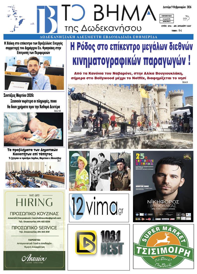 ΕΦΗΜΕΡΙΔΑ ΕΝΤΥΠΗ ΕΚΔΟΣΗ 8 Φεβρουαρίου, 2026 Κοινοποίηση FacebookTwitterPinterestWhatsApp Περισσότερα άρθρα ΕΝΤΥΠΗ ΕΚΔΟΣΗ 4 Ιανουαρίου, 2026 ΕΝΤΥΠΗ ΕΚΔΟΣΗ 2 Δεκεμβρίου, 2025 ΕΝΤΥΠΗ ΕΚΔΟΣΗ 24 Νοεμβρίου, 2025 ΕΝΤΥΠΗ ΕΚΔΟΣΗ 24 Νοεμβρίου, 2025 ΕΝΤΥΠΗ ΕΚΔΟΣΗ 8 Νοεμβρίου, 2025 ΕΝΤΥΠΗ ΕΚΔΟΣΗ 8 Νοεμβρίου, 2025 Κοινοποίηση FacebookTwitterPinterestWhatsApp Προηγούμενο άρθροΠέρασε απ’ την Ρόδο ο ΠΑΟΚ ΡΟΗ ΕΙΔΗΣΕΩΝ Πέρασε απ’ την Ρόδο ο ΠΑΟΚ 8 Φεβρουαρίου, 2026 Τηλεφώνημα για βόμβα στην ΕΡΤ 7 Φεβρουαρίου, 2026 Με διεθνείς προοπτικές και βραβεύσεις η κοπή πίτας των Εκπαιδευτηρίων ΡΟΔΙΩΝ ΠΑΙΔΕΙΑ 7 Φεβρουαρίου, 2026 Kως: Συνελήφθη 36χρονος για διακίνηση ναρκωτικών 7 Φεβρουαρίου, 2026 Ρόδος: Συνελήφθησαν 3 άτομα για υποθέσεις ναρκωτικών, κλοπής και οπλοκατοχής 7 Φεβρουαρίου, 2026 Η Ρόδος μαγνητίζει το ενδιαφέρον της ινδικής τουριστικής αγοράς στην OTM Mumbai 2026 7 Φεβρουαρίου, 2026 “Εμπόλεμη” ζώνη το ΠΑΣΟΚ: Δεν κοπάζουν οι αντιδράσεις για τις καρατομήσεις – Στο στόχαστρο ο γραμματέας Οργανωτικού 7 Φεβρουαρίου, 2026 Το 25ο Καρναβάλι Σορωνής έρχεται πιο εντυπωσιακό από ποτέ! 6 Φεβρουαρίου, 2026
