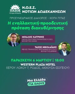 Η Νομαρχιακή Οργανωτική Επιτροπή Συνεδρίου ΠΑΣΟΚ- Κινήματος Αλλαγής Νοτίων Δωδεκανήσων καλεί τα μέλη και τους φίλους του Κινήματος να συμμετάσχουν στην ανοιχτή εκδήλωση για τον προσυνεδριακό διάλογο και την καθιερωμένη κοπή της πρωτοχρονιάτικης πίτας. Η εκδήλωση εντάσσεται στο πλαίσιο της πανελλαδικής διαδικασίας διαλόγου ενόψει του Συνεδρίου και φιλοδοξεί να αποτελέσει βήμα ουσιαστικής ανταλλαγής απόψεων για τις πολιτικές προτεραιότητες και τις οργανωτικές τομές του Κόμματος.