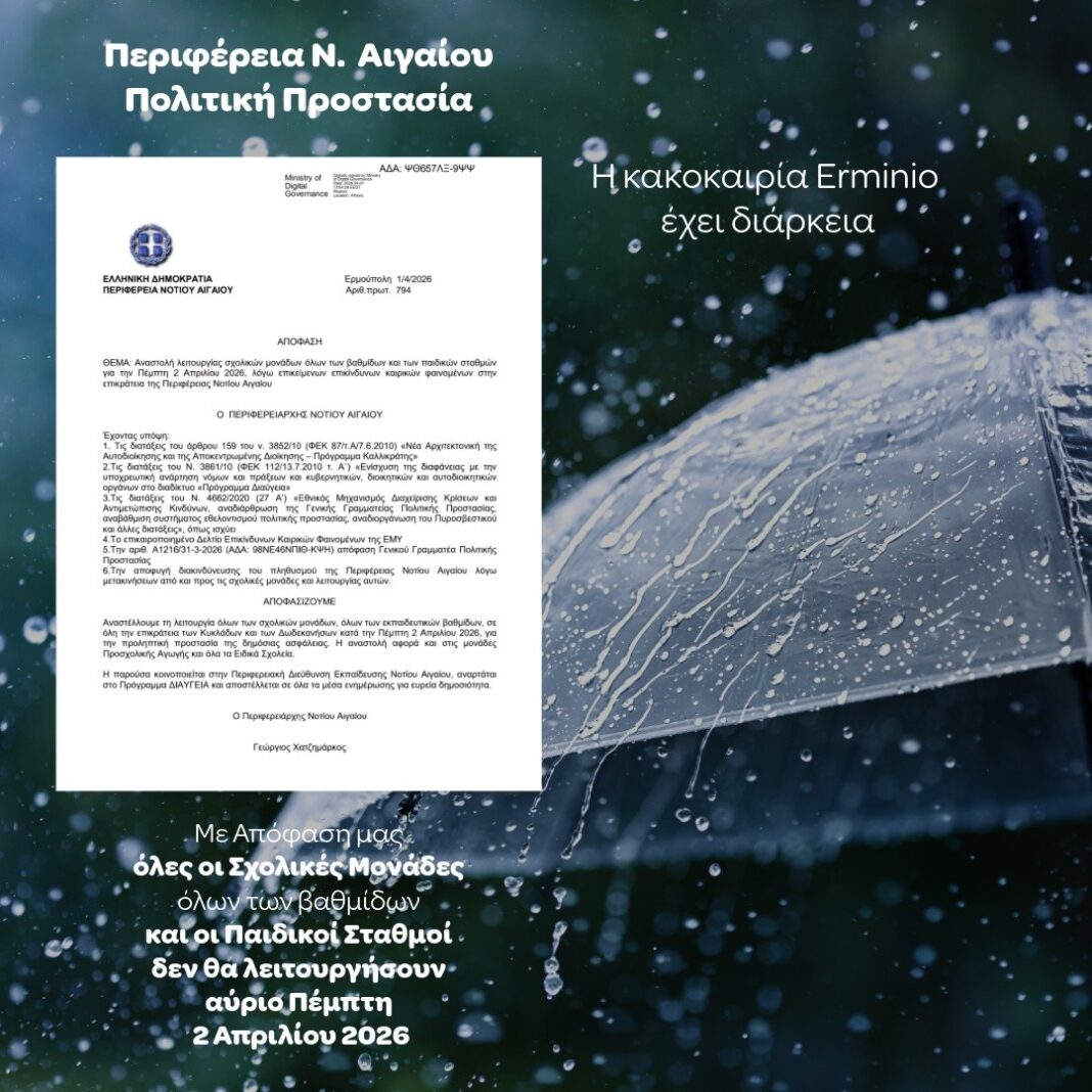 Αναστέλλουμε τη λειτουργία όλων των σχολικών μονάδων, όλων των εκπαιδευτικών βαθμίδων, σε όλη την επικράτεια των Κυκλάδων και των Δωδεκανήσων κατά την Πέμπτη 2 Απριλίου 2026, για την προληπτική προστασία της δημόσιας ασφάλειας. Η αναστολή αφορά και στις μονάδες Προσχολικής Αγωγής και όλα τα Ειδικά Σχολεία.